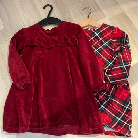 Strømpebukser er fra H&M, str 98/104 men virker romslig. Noe slitasje på sålene (se bilder) men passer utmerket til kjolen, mye bruk igjen.
