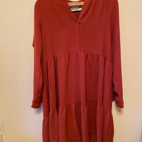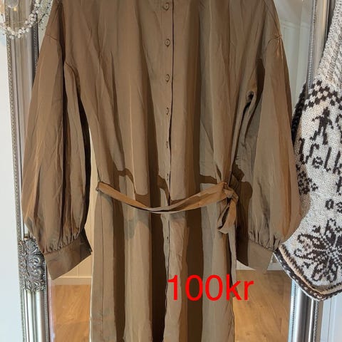 Nesten ny skjortekjole. Litt stor i størrelsen, knytes lett i livet. Knelang.