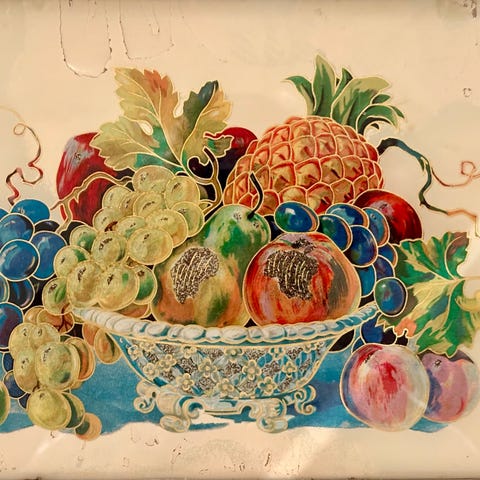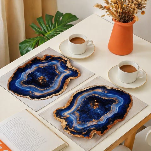 Spisebrikker/ brikker til å ha under tallerkner med kunstnerisk bilde, undersiden er kork.
