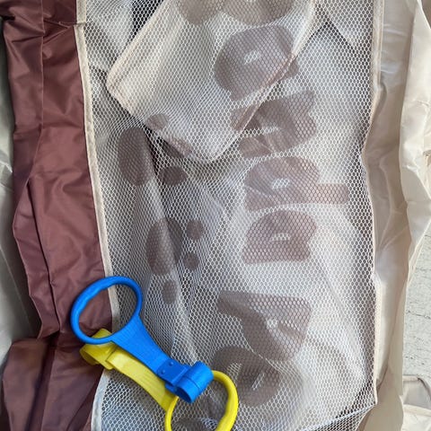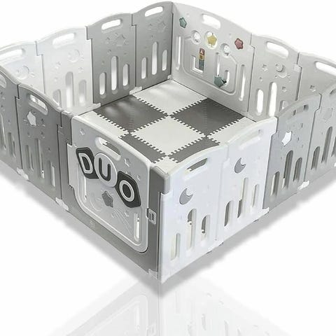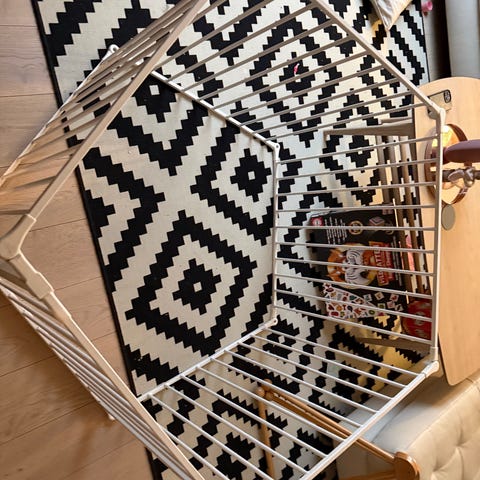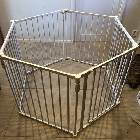 Nesten ubrukt, sammenleggbar lekegrind fra lionelo, kan legges sammen og trekkes ut på en blunk. Oppbevaring trekk følger med.