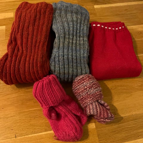 Alt er i størrelse 6 år. Anmerkning på den ene knappen på cardigan. Hull som er sydd på den rosa genseren fra Lanullva.