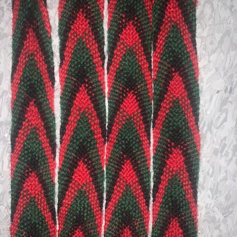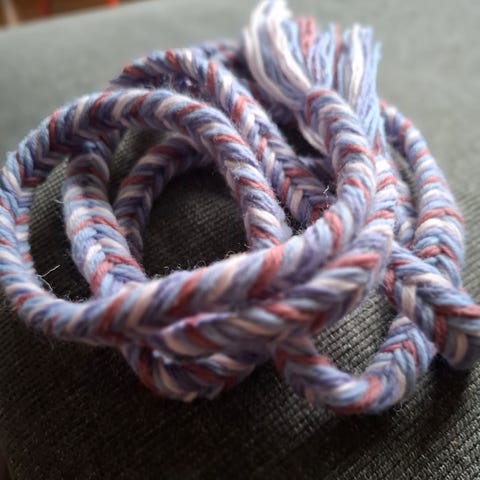 Flettet bånd i ull. 248cm langt uten duskelengden. Kan lage fyldigere dusker hvis ønskelig. Samisk fletteteknikk. Rosa/lilla/blå.