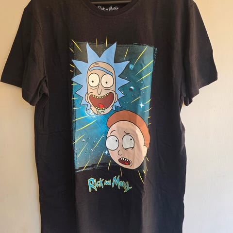 100 % bomull t-skjorte med Rick and Morty-trykk. Helt ny med lapp. Kjøpt i Sør-Afrika. Jeg har mange andre t-skjorter, se gjerne på mine andre annonser, kjøp flere og spar frakt!