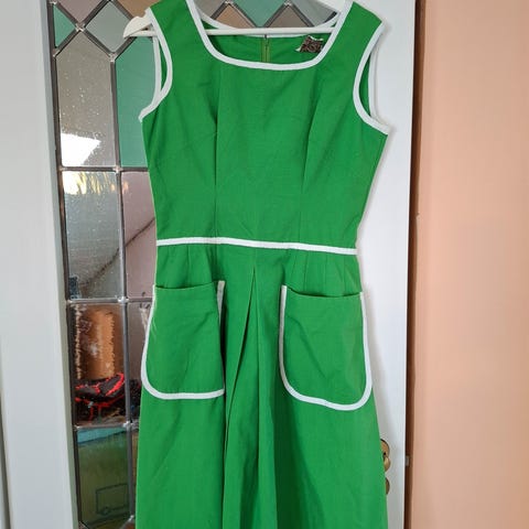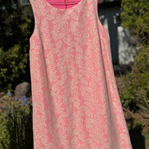 Nydelig kjole i duse, fine toner av rosa og grønt. Vintagestil, kjøpt hos Selfridges i London. Lappen sier S/M. Jeg har brukt den som XS-S, men det er en ganske fleksibel kjole. Stretchmateriale i skjørtedelen. Glidelås i skjørt, knapper bak nakken, semi-åpen rygg. Kun brukt ved 2 anledninger.