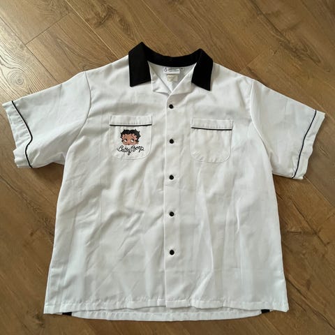 Nesten ubrukt "bowlingskjorte" i kule striper.
