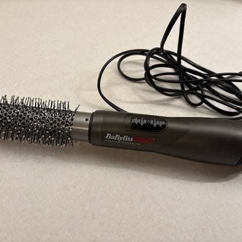 Babyliss Hydro Fusion AS773E varmluftsbørste i blå farge. Denne enheten kombinerer varme og luftstrøm for å style håret effektivt. Den har flere varmeinnstillinger og en roterende børste som gir volum og glans til håret. Ideell for daglig bruk og enkel styling.