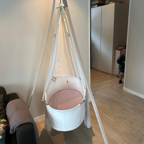 Fra det jeg har sett så er den uten hull. Brukt av 1 barn, kjøpt for 6mnd tid siden