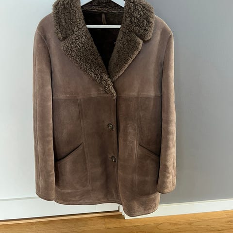 Kun og behagelig skinnjakke i str. 38 fra H&M. Imitert skinn samt saueskinn som krage. Jakken har lommer og spenne i halsen. Selges for 200kr