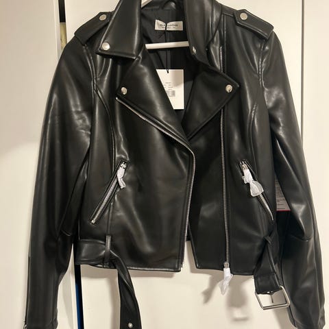b.young skinnjakke for damer i størrelse 40, svart farge. Jakken har en kort modell med glidelåser og detaljer i skinnmateriale.