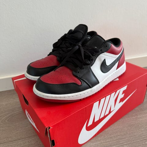 Air Jordan sneakers i størrelse 43. Disse skoene har et klassisk design i rødt, svart og hvitt. De er laget for komfort og stil, egnet for både hverdagsbruk og sport.