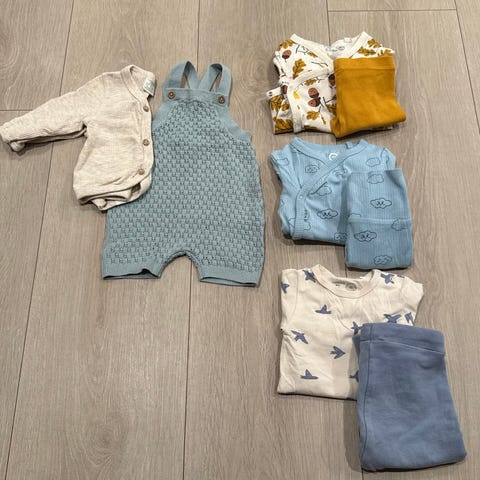 5 kortermet bodyer, 3 av de er ubrukte, 2 sett og en romper
