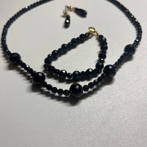 Onyx armebånd, utvidbart. Grå sorte kuler, polert