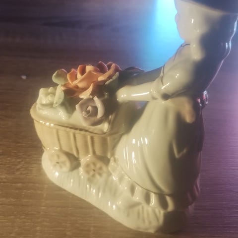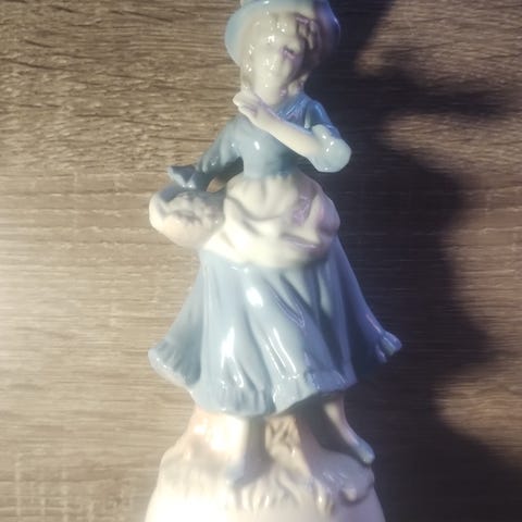 Beskrivelse: Elegant porselensfigur av en dame i klassisk kjole med kurv. Dekorert i blå-hvite farger med gull-detaljer. Perfekt til interiør eller samling. Høyde ca. 20 cm.