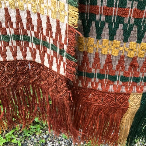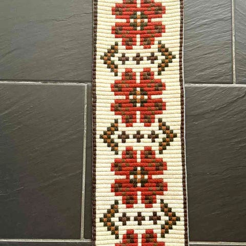 Flott brodert åkle/ teppe/ løper med smijern oppheng selges. Fine retro farger. Helt og pent og i god stand. Korssting.