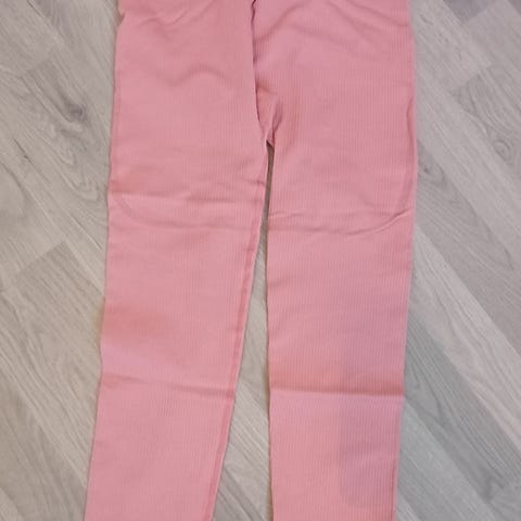 treningsbukser for kvinner i størrelse M. Den ene buksen er flerfarget med et abstrakt mønster, mens den andre er grønn med detaljerte sømmer. Passer til trening og fritidsbruk. Merket på den grønne: BLACC