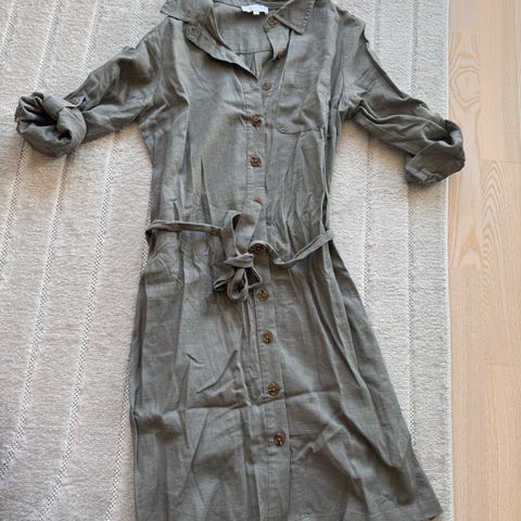 Koret kjole i hvite og sorte striper i str. S/XS. Den er glatt, myk og fin. Brukt en gang. Veldig stilig med sort bred belte rundt livet. Den er litt smal nederst, så man får ikke løpt helt med denne kjolen. Kan også ha på en tights som passer dersom man synes den er for kort.