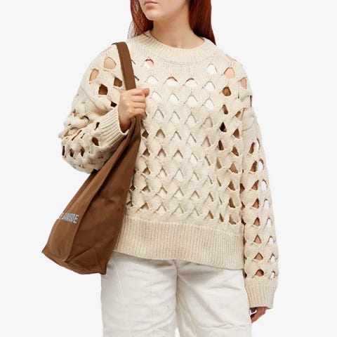 Den er stor i størrelsen, veldig pent brukt. Virker som den er strikket i akryl eller lignende. Denne er helt unik!