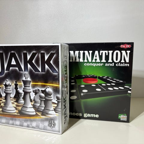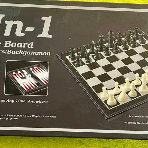Boksen inneholder et tosidig spillbrett (for sjakk/dam og backgammon/tic-tac-toe), sjakkbrikker, dambrikker, dominobrikker og terninger.