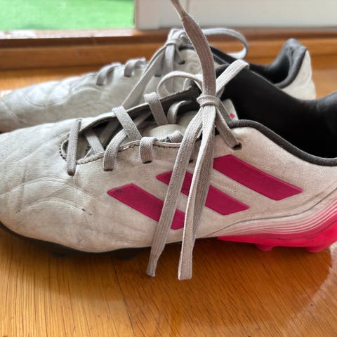 Adidas Copa Pure fotballsko i hvit farge. Slitasjen og bruksmerker på skoene er kun kosmetisk, de er hele og tåler mange flere timer på en fotballbane! Selges fordi skoene har blitt for små til husets fotballspiller.