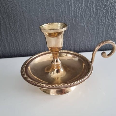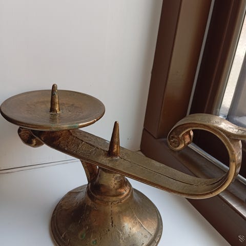 Lysestake i messing for kubbelys, med lyseslukker. Veier 1,37 kg, er 20 cm bred og 14-15 cm høy.