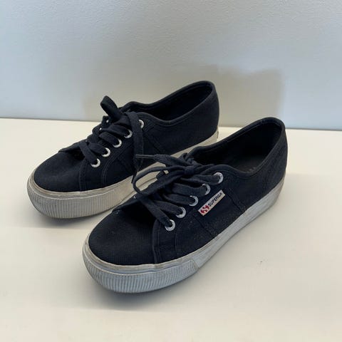 Selger et par klassiske Superga-sneakers i mørkeblått med hvit såle, størrelse 40. Disse skoene passer til det meste og er en tidløs modell som aldri går av moten. De er nesten ikke brukt, men skoene har noe vann/støvflekker foran som ikke er forsøkt fjernet. Nypris var kr 1199. Kan sendes eller hentes i Oslo.