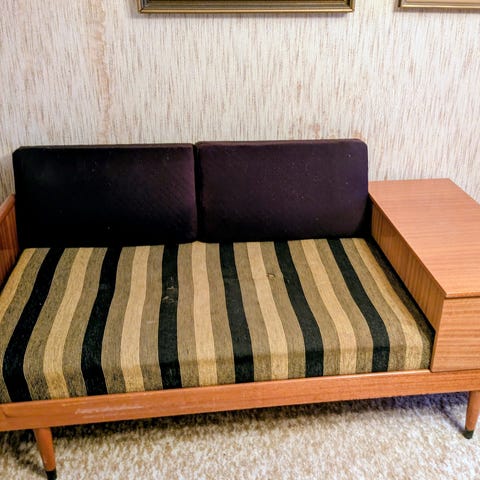 Bøverdalen/Budal. En liten skade i stoff i et av hjørnene, samt en fargeflekk. Til bruk som sovesofa anbefales ny skumgummi.