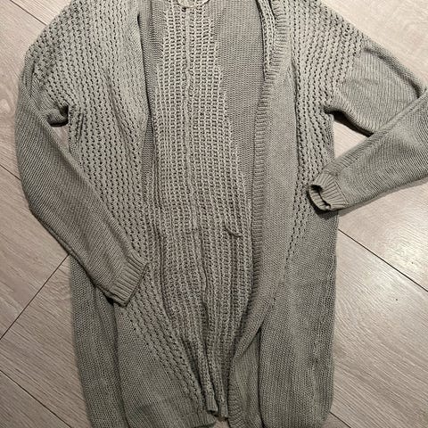Lang cardigan med korte ermer og knyting i livet. Str. S, oversized. Store, ledige lommer. Nydelig okergul farge, passer fint til høsten.