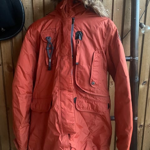 Størrelse dame: S (M) Alle lommer har borrelås, også halsåpning, som også har ekstra lang glidelås. Pelskragen er ulv.