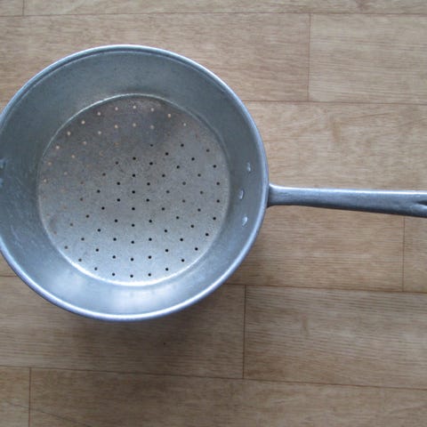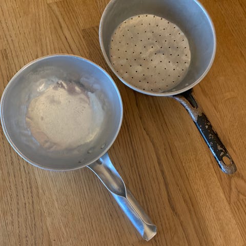 Gammelt dørslag Total lengde 33 cm - 16 cm i diameter. 6 cm høy. Merket inni 27 og 16 cm. Bruksmerker og selve håndtaket slitt svart maling.