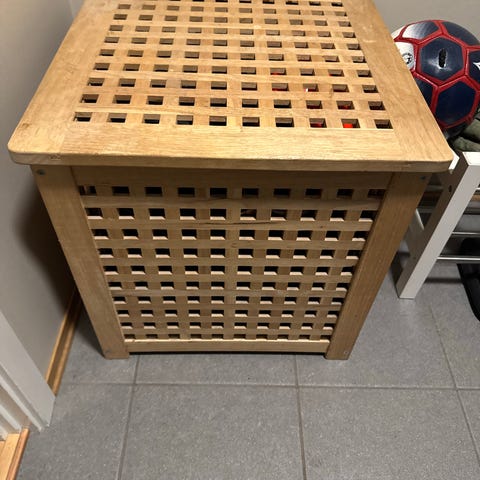 Oppbevaringskasse i flettet materiale med mørkebrun farge. Kassen har lokk med hengsler og er egnet for oppbevaring av diverse gjenstander. Passer til bruk innendørs, for eksempel i stue eller soverom.
