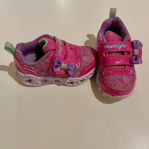 Skechers blinkesko i størrelse 21. Disse skoene har komfortabel passform og er deelle for aktive barn, med solid såle og enkel borrelås for lett av- og påtaking.