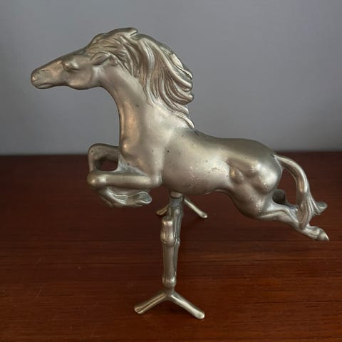 Flott utskåret Hest i tre med sal og seler i skinn og man og hale i hår, VINTAGE, selges
