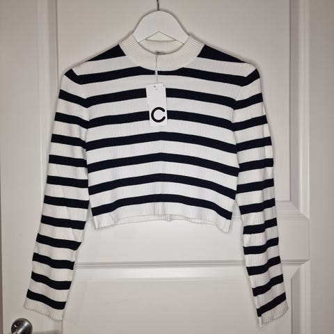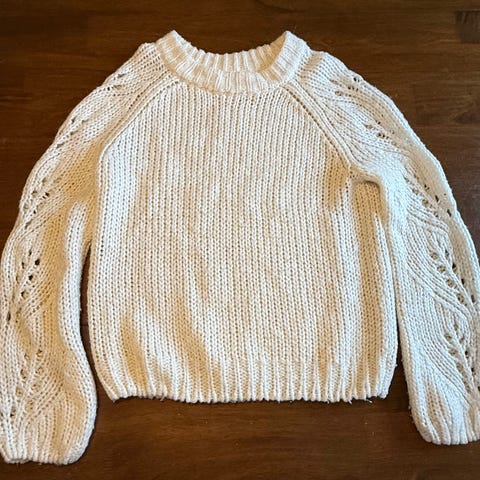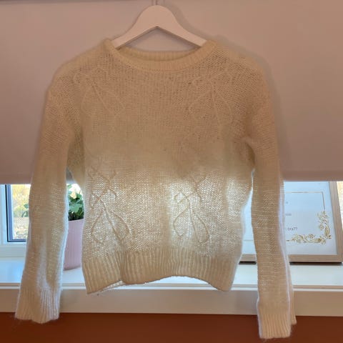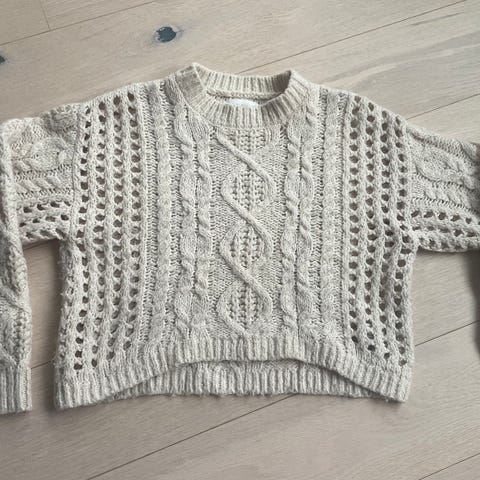Cubus genser i størrelse 164 for jente. Fargen er hvit. Genseren har et mønster i ermene og er laget av et strikket materiale, noe som gjør den egnet for kjøligere vær.