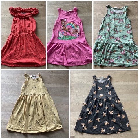 4 kjoler, 1 topp, 1t skjorte, 1 lett jakke, 1 capri tights og 1 shorts.