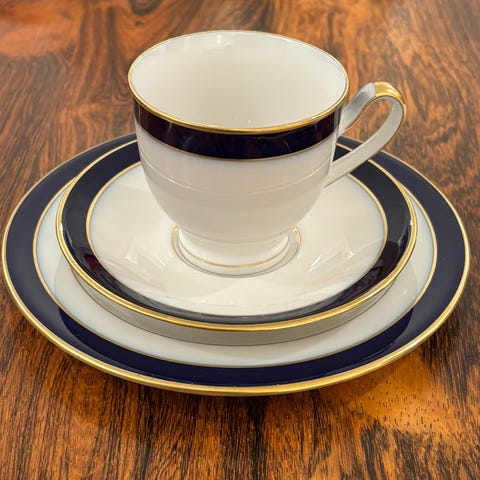 Nydelig servise med en vakker bord i koboltblått. Gullkantene er i polergull og har et flott etset mønster. Virkelig et servise for den kvalitetsbevisste. Det er kun brukt 2 ganger