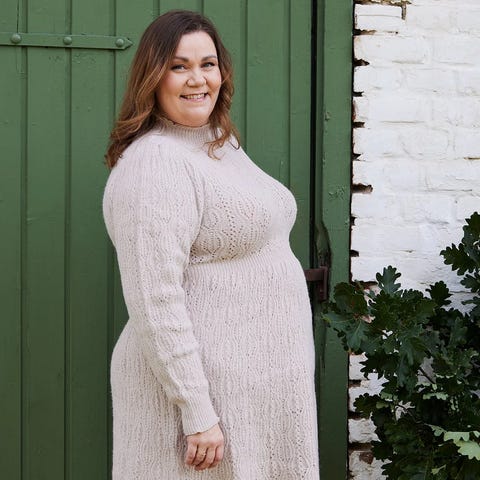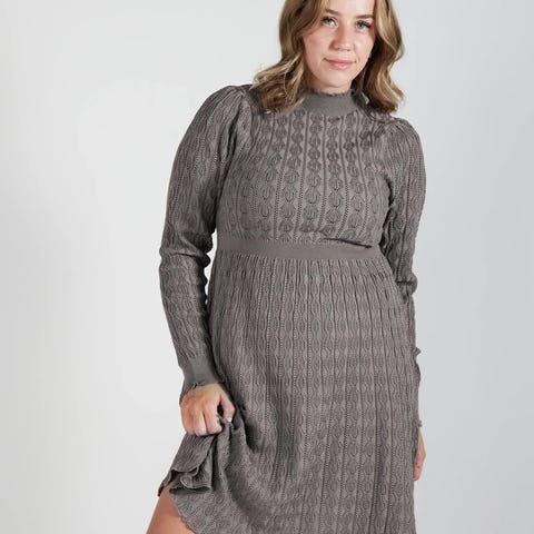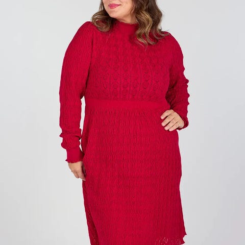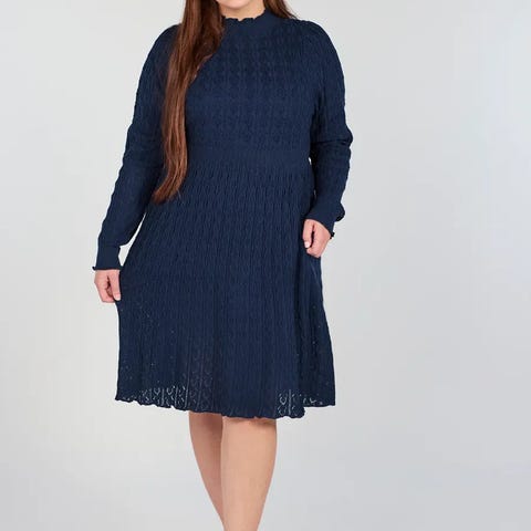 Dette er en knelang, langermet strikkekjole med flatterende passform. Den har høy hals med liten volangkant, innsvinget midje og et helskjørt som faller lett. Stoffet har et gjennomgående strukturmønster. Passer like godt til både til hverdags og mer pyntede anledninger.