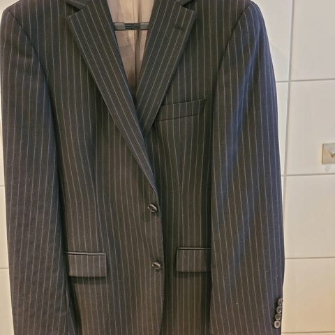 Meget pen grå grønn ull med nålestriper, italiensk design med to folder bak. Mange innerlommer og knapphull i krave til å feste pynt i