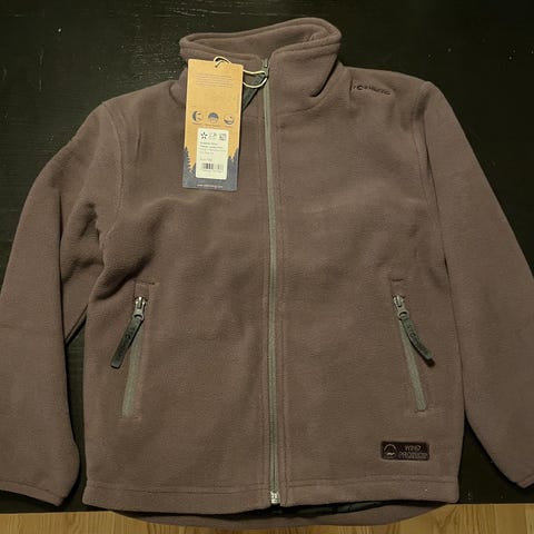 Selger Stormberg fleecejakke med vindstopp i str. 122. Jakken har fått et lite brennmerke ved siden av glidelåsen (se bilde), men påvirker ikke bruken.