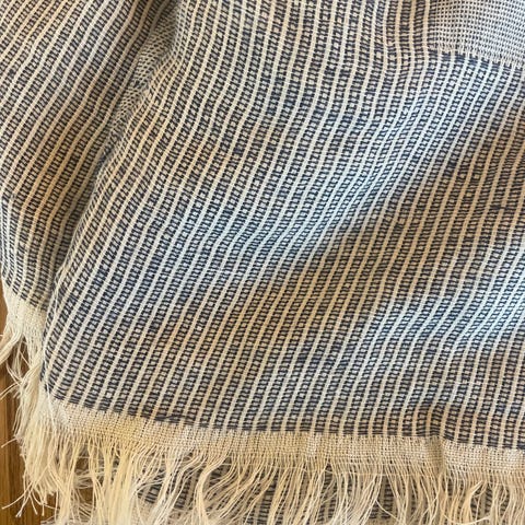 Lite brukt, langt skjerf fra Jackpot 100% viskose. Mørkeblått med hvite store prikker. Frynser i endene. Lengde 186 cm, bredde 55 cm.