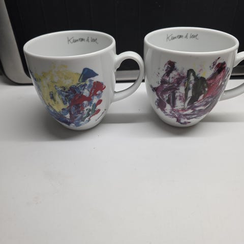 Asjettene er ca 18 cm i diameter og underskålene ca 14 cm.
