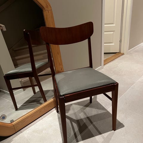 Stolen er i god stand til tross for dens alder. Finnes ubetydelige bruksmerker på stolbenene (se bilder). Vi har ikke oljet treverket på lenge