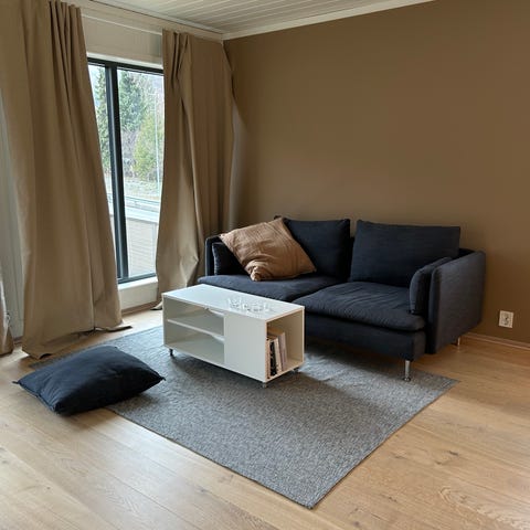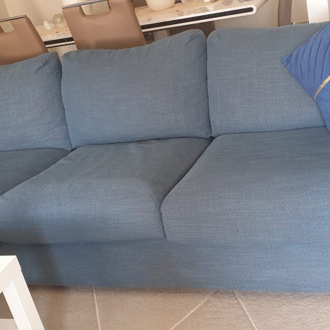 Selger en stor og komfortabel sofa i gråblå farge (se bilde). Sofaen har god sittekomfort og passer perfekt både til avslapning foran TV-en eller når du får besøk.