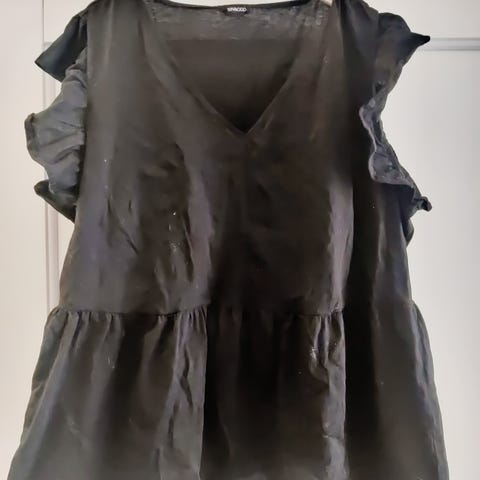 Svart topp fra Even&Odd i str. 48 selges. Omslagsmodell. Kun brukt et par ganger. Fin bølgeavslutning nederst på bol og ermer.