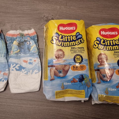 Huggies Little Swimmers bleier er designet for svømming og er i str.5-6, passer barn med en vekt på 12-18 kg, men de kan selvfølgelig brukes litt over og under angitt vekt. Bleiene har fargerike motiver og er laget for å ikke svelle i vann. De er ideelle for bruk i basseng eller på stranden, og gir komfort og beskyttelse under vannaktiviteter.