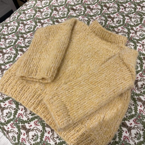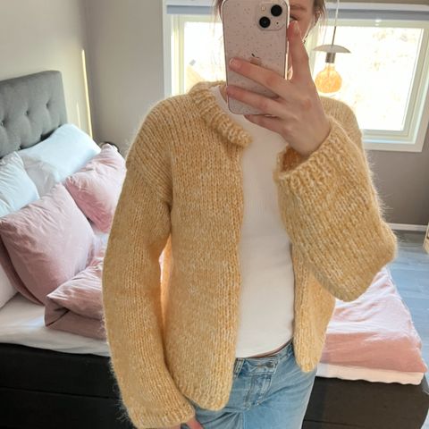 Lemoncardi by Maria tessem. Strikket i dobbel tråd myk påfugl, blanding av hvit og gul