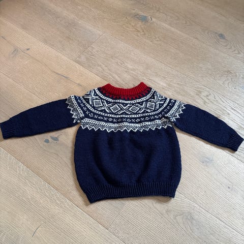 Strikket Marius ullgenser til jente str. 92/98. Pent brukt. Kommer fra røyke- og dyrefritt hjem. En tråd er litt lang, men kan festes, dras inn :) i ull :)
