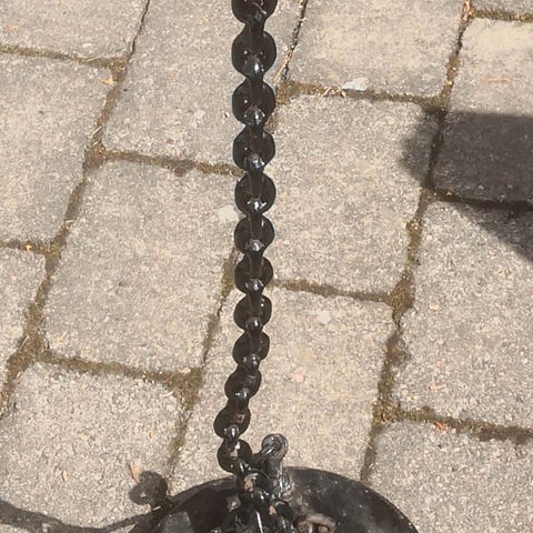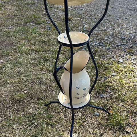 Potten som inngår i stativet er kjegleformet med en diameter oppe på ca 30 cm. Høyden på potten er ca 21 cm. Stativet er i smijern og dette er ca 125 cm høyt. Både fot og potteholder på stativet er formet som likesidede trekanter hvor hver side nede er ca 40cm og oppe ca 20cm. Dersom denne ønskes kjøpt enkeltvis er prisen kr 300.