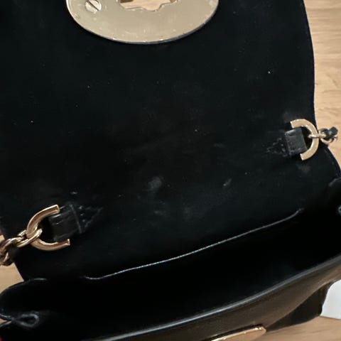 Nydelig clutch i svart skinn med gulldetaljer fra Mulberry selges.