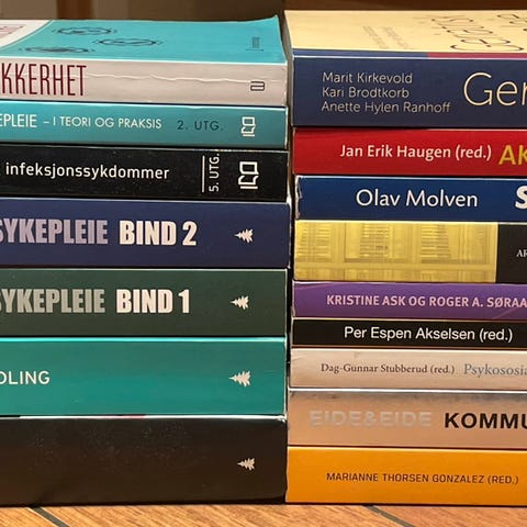 Selger pensumbøkene mine fra sykepleiestudiet. Jeg fullførte utdanningen i fjor, så de fleste bøkene er relativt nye og pent brukt – flere ser helt ubrukte ut. Noen av bøkene er litt eldre og har normale bruksspor, men alle er i god stand. Send pm for spørsmål :)