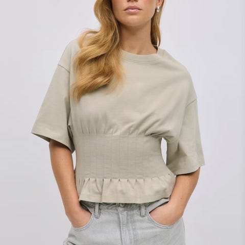 T-skjorte med rynker i sidene. T-skjorten er brun og har tilpasset midje. Den har rund hals, utringet skulder, kort erme og kort lengde.
